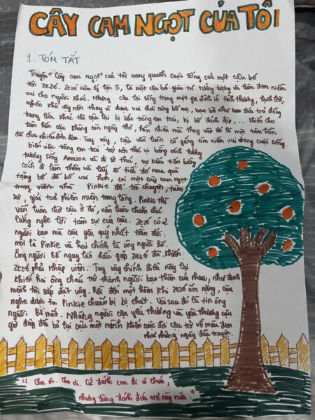 Trong buổi học này, cô Thảo Nhi cùng các bạn học sinh bước vào thế giới của tác phẩm “Cây cam ngọt của tôi” – một câu chuyện sâu sắc về tuổi thơ, tình yêu thương và sự chữa lành. Các bạn nhỏ không chỉ đọc, mà còn đọc sâu – để hiểu, để cảm, và để sẻ chia. Từ cảm xúc ấy, các con đã sáng tạo nên những bài viết, bức tranh và poster tinh tế, thể hiện rung động chân thành của trái tim và khả năng cảm thụ thẩm mỹ đáng trân trọng.
