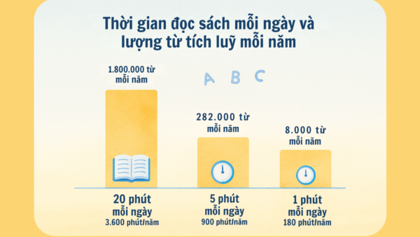 Nghiên cứu của Nagy và Herman (1987) cho thấy: trẻ đọc 20 phút mỗi ngày có thể tích lũy tới 1,8 triệu từ mỗi năm, trẻ đọc 5 phúttrong khi trẻ chỉ đọc 1 phút/ngày chỉ đạt khoảng 8.000 từ. Sau vài năm, khoảng cách ấy tạo nên sự khác biệt rõ rệt về vốn từ, khả năng tư duy và kết quả học tập.